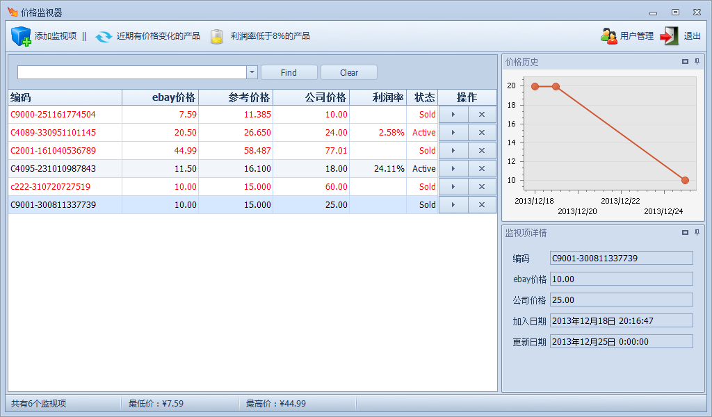 - 定时扫描监视列表中的所有产品,更新eBay上的价格,并计算出客户的利润率。