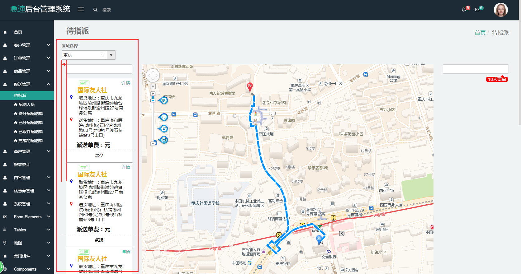 2. 能实时指派在线且距离较近配送员上门取件并配送;